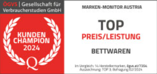 Kunden Champion 2024: In der Kategorie "Preis/Leistung" wurden unsere Bettwaren von der ÖGVS geprüft und ausgezeichnet.