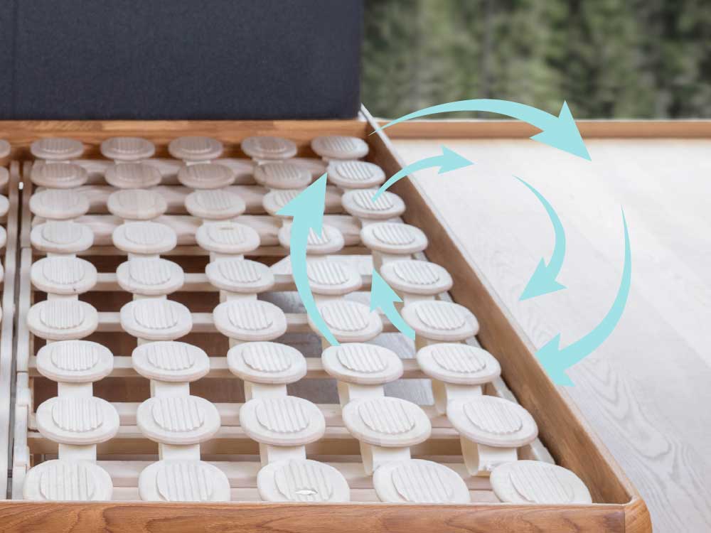 Der Lattenrost Relax 2000 besteht aus Massivholztellern, die auf dreidimensional beweglichen Spezialfederkörpern gelagert sind